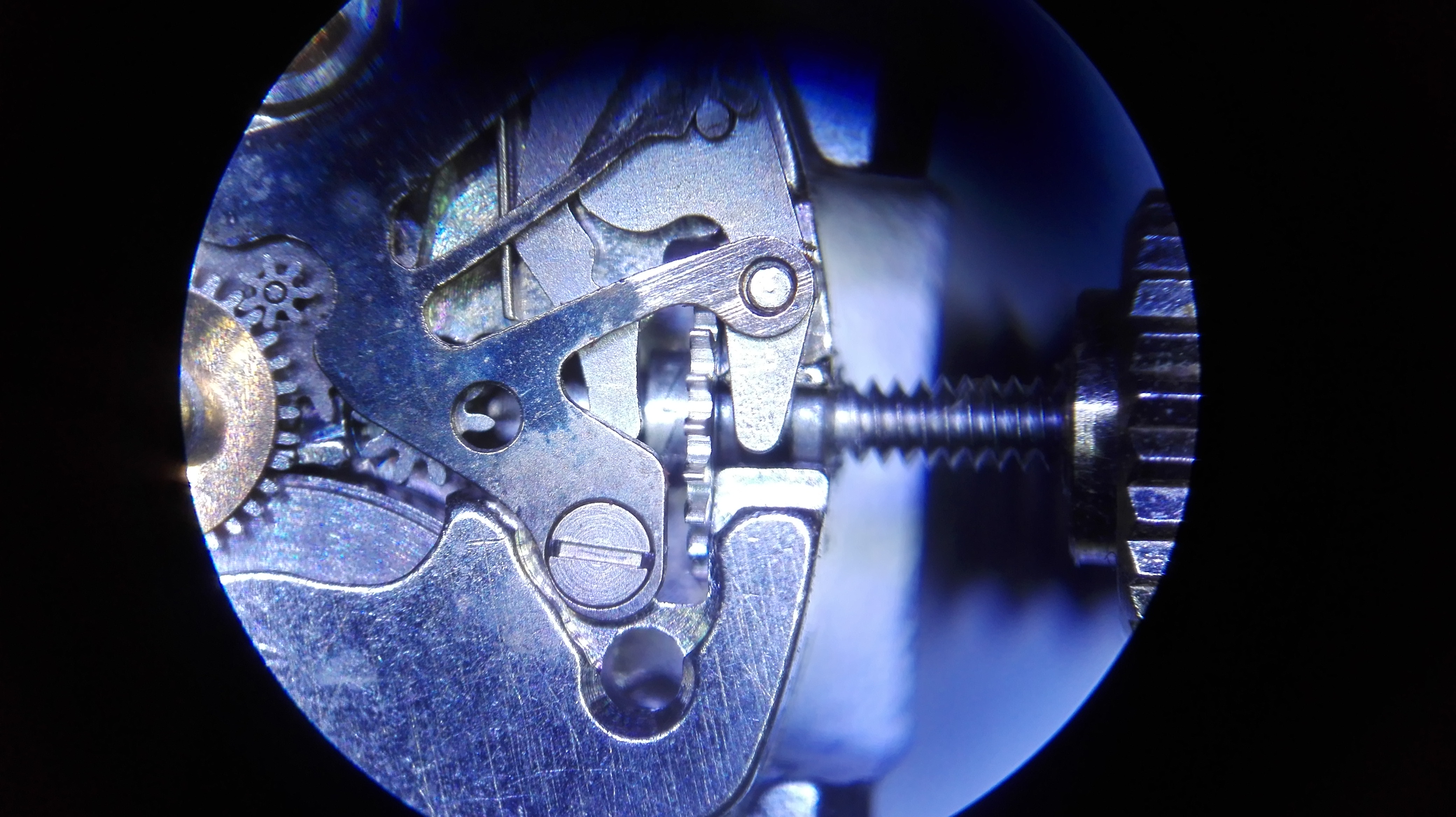 これはリューズから、時間合わせをしたり、ぜんまいをまいたりする部分を文字盤側から見た状態です。リューズの巻真(ネジ山が見える部分)も錆も無く、なかなか綺麗、金属がすれる部分のグリースはもう見えない状態(滑りが悪い)です。